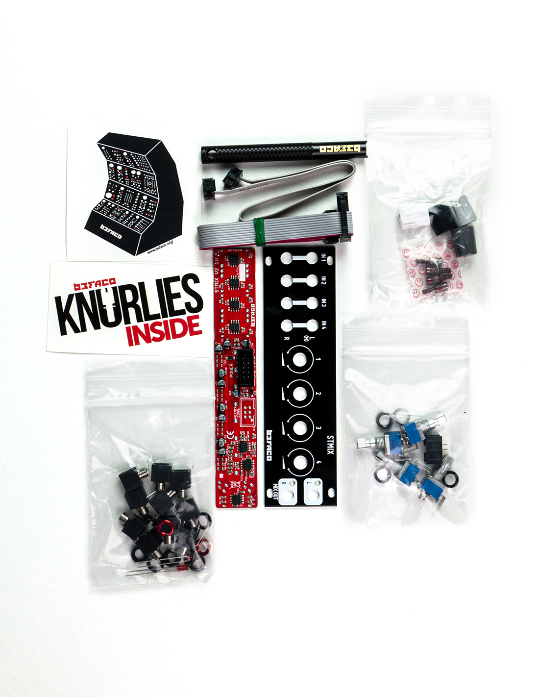 STMix is a four-channel stereo mixer in 28hp and 1U format. It can work independently or as an expansion of our Hexmix module via the six-pin connector located in the back. The module is designed under the Intellijel 1U format.