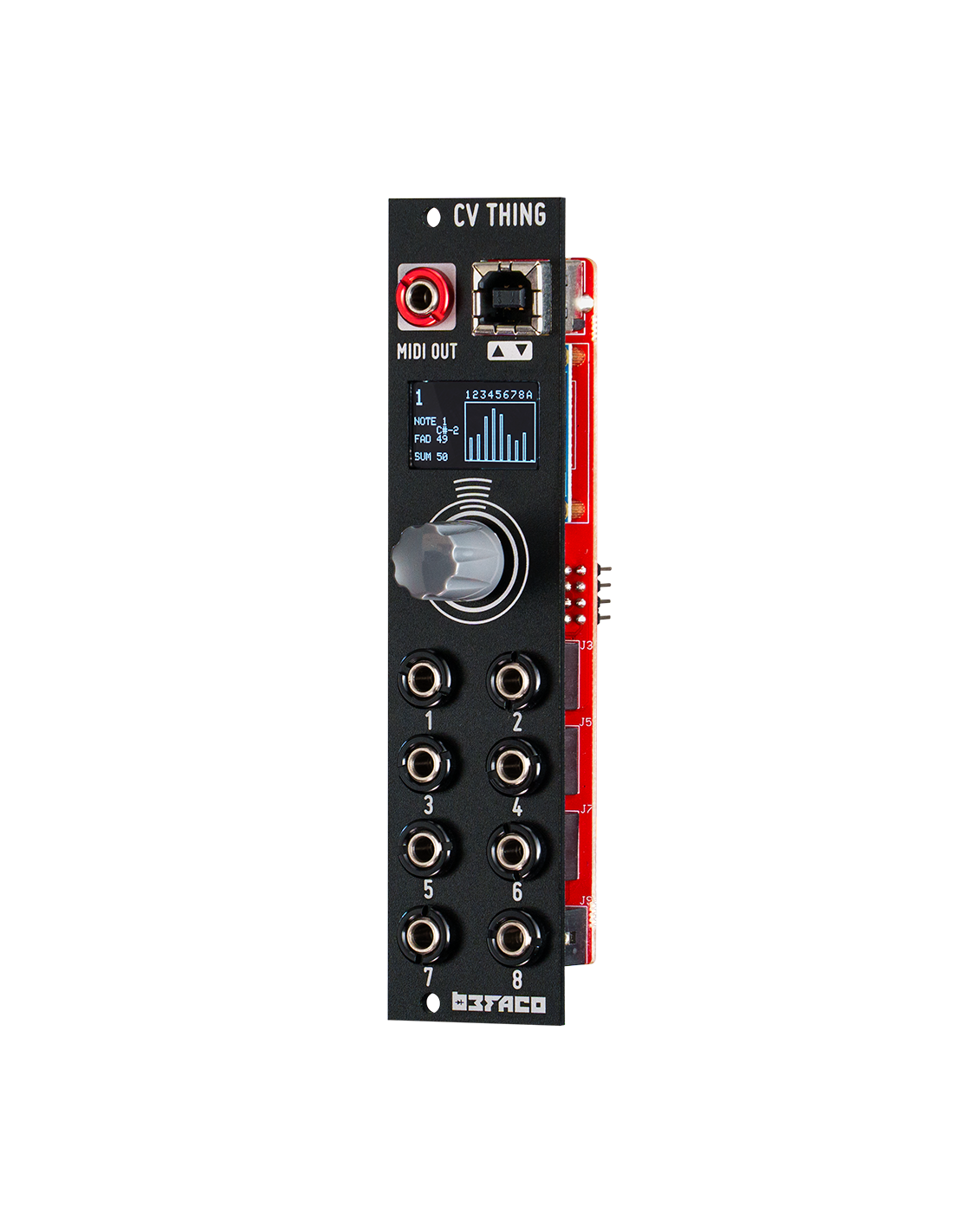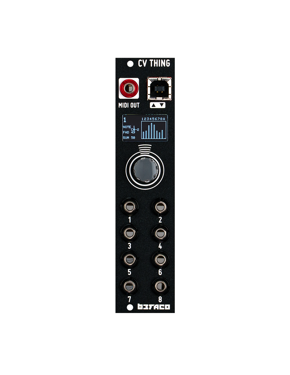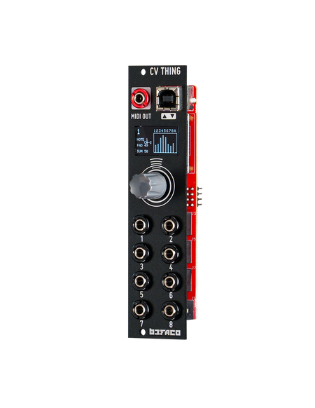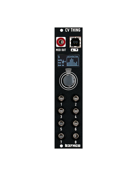 Cv thing is a fully mappable CV to MIDI converter in just 6HP. Its based on our VCMC module, but aiming for small and compact performance rigs. It has eight inputs that can be mapped to any MIDI message quite easily thanks to its simple and intuitive user interface. Ccs, Program change,v/oct to Note, or Clock are some of the messages that can be configured to easily control MIDI gear from your modular rig.