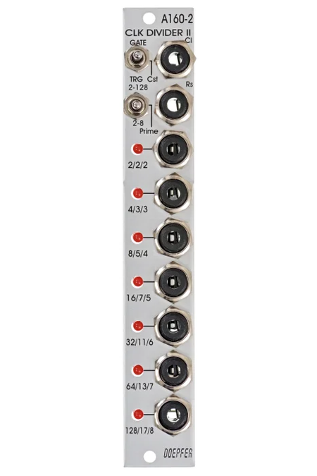 Module A-160-2 is an enhanced version of the standard clock divider A-160. The module is a frequency divider for clock/trigger/gate signals, designed to be a source of lower frequencies, particularly for rhythm uses.