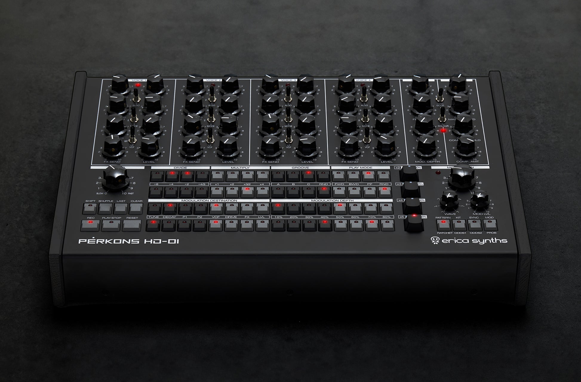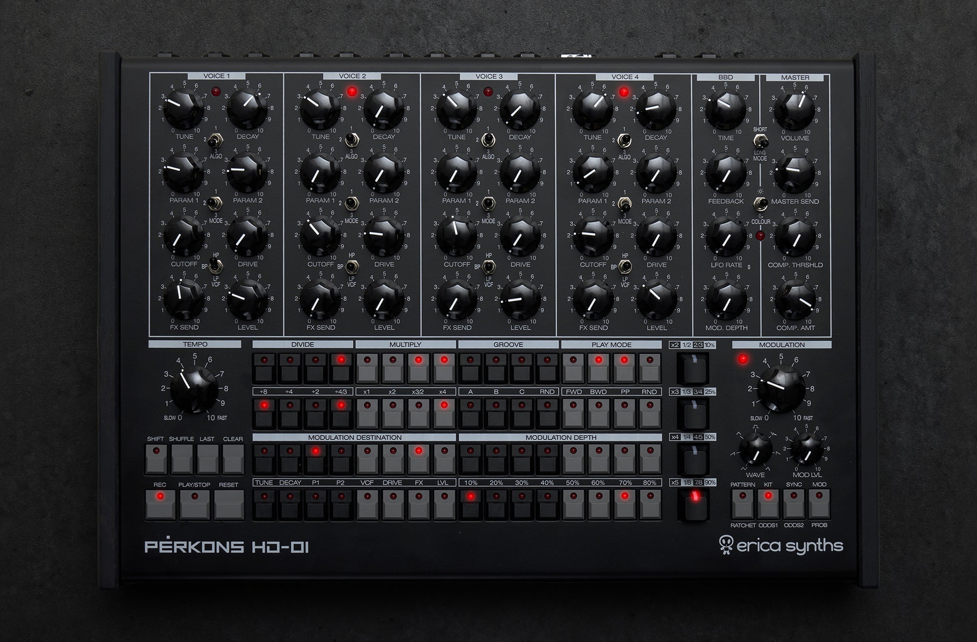 PĒRKONS features four sonically versatile hybrid voices (digital sound engine + analogue multimode filter with overdrive) and a sequencer with simultaneous control over all four percussion tracks.