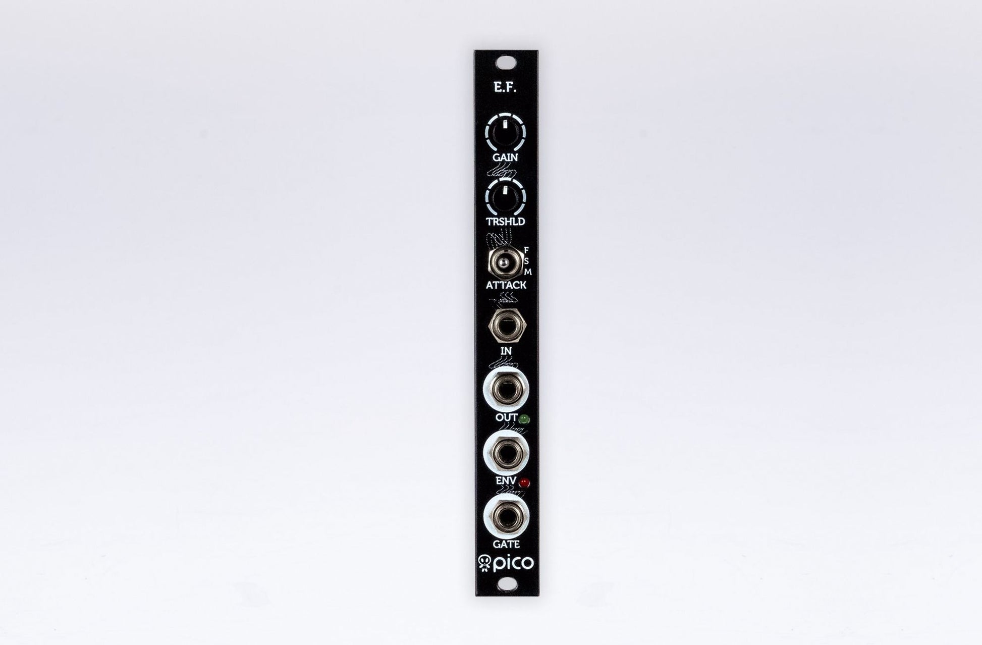 Pico EF is Erica Synths take on envelope follower module in 3hp! Pico EF features a preamp with +40dB gain (enough to boost even guitar and dynamic microphone signals for use in a modular system), envelope output with adjustable attack time and a gate output with adjustable threshold. The Pico EF can be used as a preamp, overdrive unit or for controlling VCFs with audio signal, or to use with external instruments to control your modular system in other creative and experimental applications.