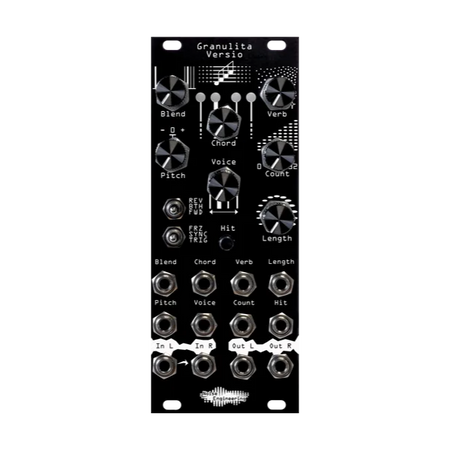 Granulita gives you control over harmony, grains, and more. Blend through 16 different choices of chords/intervals and a Voice parameter that sets the note that tracks the input. The unquantized Pitch control acts as an offset for the entire resynthesizer: detune or transpose the output to create dissonant atmospheres, even more drastic harmonies, or ominous movement and vibrato. Grain count and length are parameterized to help you shape the sound you seek. The Verb control adds some shimmery atmosphere a la our unique take on reverb. And because it’s a Versio, the comprehensive controls are CV-able. For even more granular goodness, the gate input and corresponding Hit button can be configured to freeze grain playback, sync grain timing to an external clock, or fire grain playback from an external trigger source.