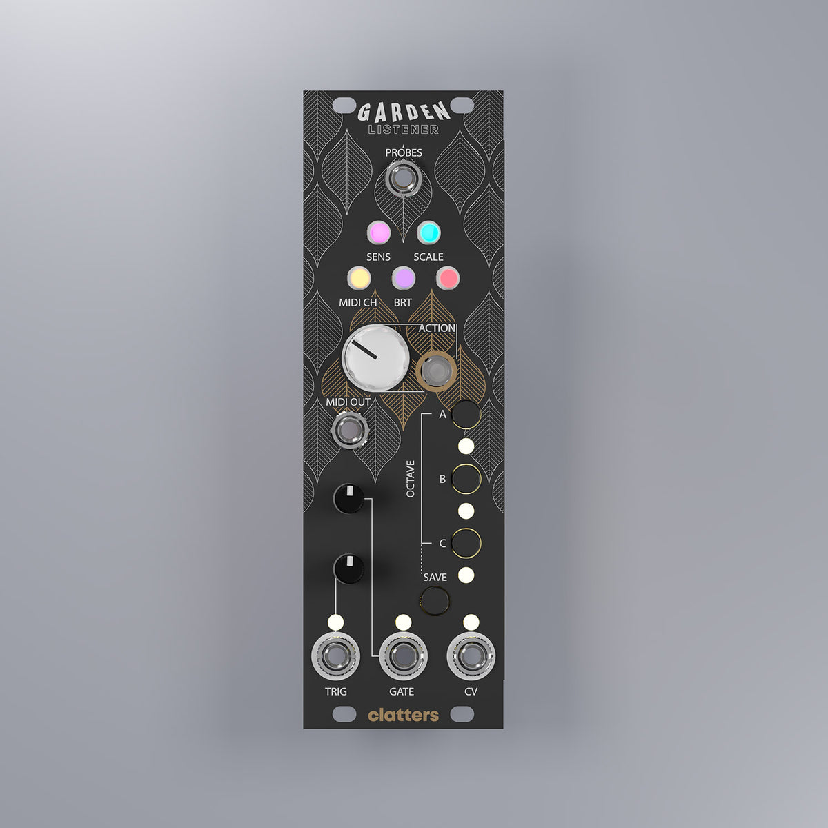 Clatters Garden Listener genererer CV og gate fra biometriske signaler. Det vil si at du kan sette to de to medfølgende probene i panna di, favorittplanten din eller på andre ting som har en overflate med varierende lednignsevne 🤯 Garden Listener sender også MIDI via en medfølgende 3,5mm MIDI-adapter. Notene den sender ut er fra C-1 til C8, og CV-signaler er fra 0–5V. Modulen har en innebygget quantizer så du kan velge mellom flere forskjellige skalaer.
