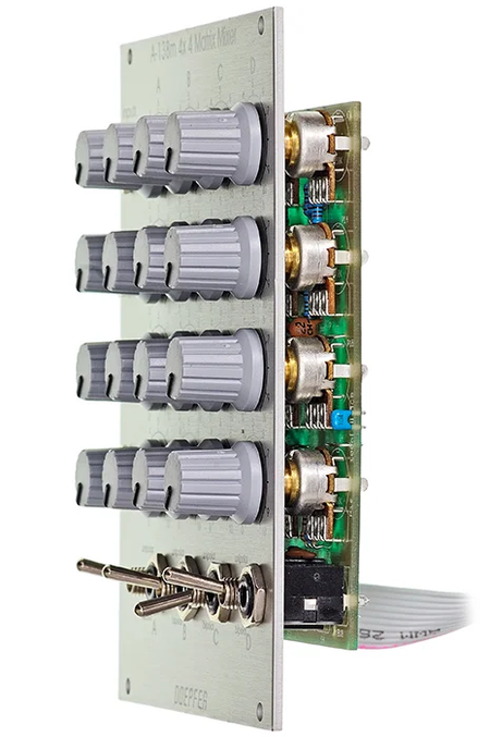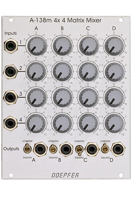 Module A-138m is a 4 x 4 matrix mixer with switches for unipolar/bipolar mode for each column.