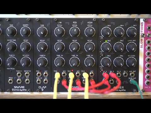 This is a triple module, with each voice having a separate output, with no on-board summing. Each features pitch and decay controls, enabling you to tune the low, mid and high toms to taste. The toms have a not unexpected TR-909 tonality and impact.