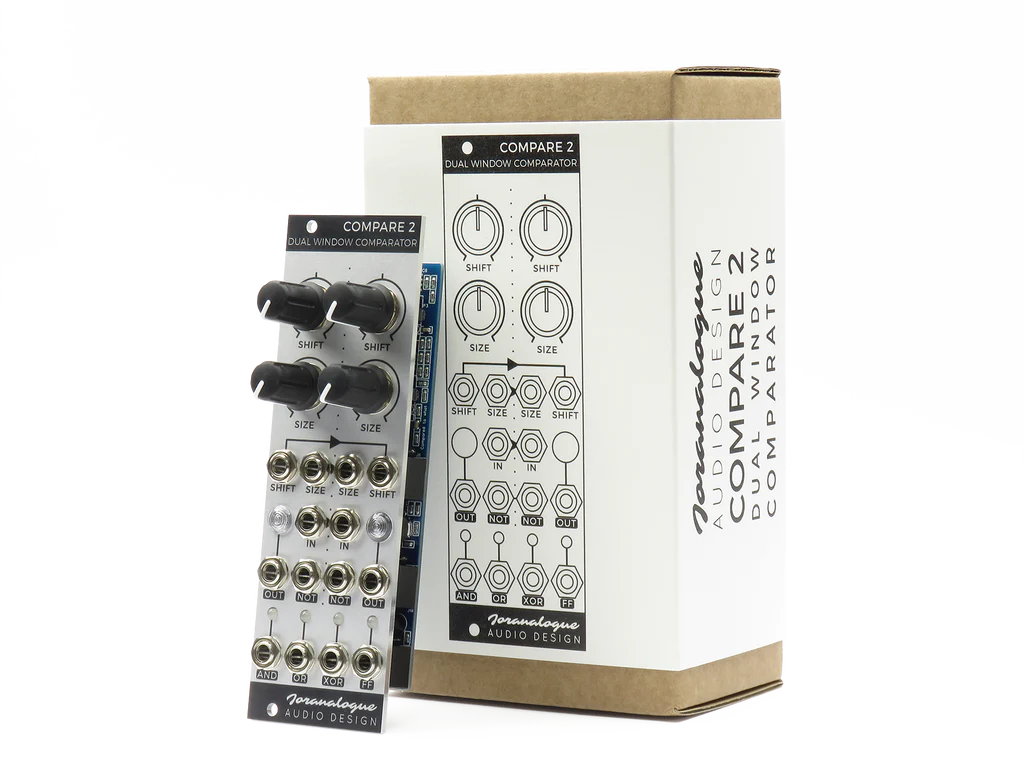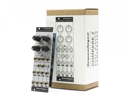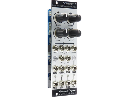 Compare 2 combines two such comparators and a logic section in 8 HP. The result is an advanced tool for extracting gates and pulses from analogue signals in Eurorack synths.