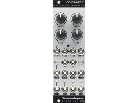 All inputs are normalised from the left section to the right, but the two comparators can also be used completely independently. On the bottom, the outputs from both comparators are combined in various ways by the logic section, which also features LEDs.
