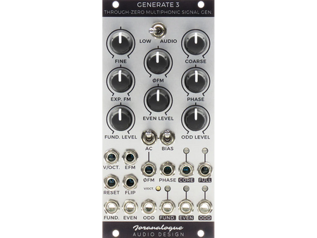 Any signal can be expressed in terms of a few parameters: frequency, phase, amplitude and timbre. It is through modulation of these aspects that synthesists create electronic sound. With Generate 3, it is now possible to create a signal and control all its parameters by through-zero modulation within a single 12 HP wide module.
