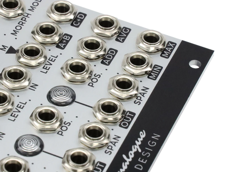 Four linear amplitude modulators are controlled by a master ‘morph’ parameter. The response of each modulator to this parameter is completely variable, both manually and under voltage control, and can be overridden if desired. Each response is triangular, with the ‘position’ parameter setting the maximum point along the morph axis, while ‘span’ determines the width of the triangle’s base.