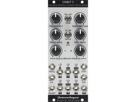 The voltages at each of the module’s outputs can be thought to describe the orbit of a particle through 3D space around two equilibrium points. The positions of these points, as well as the distribution of the orbits and rate of movement can all be adjusted under manual or voltage control.