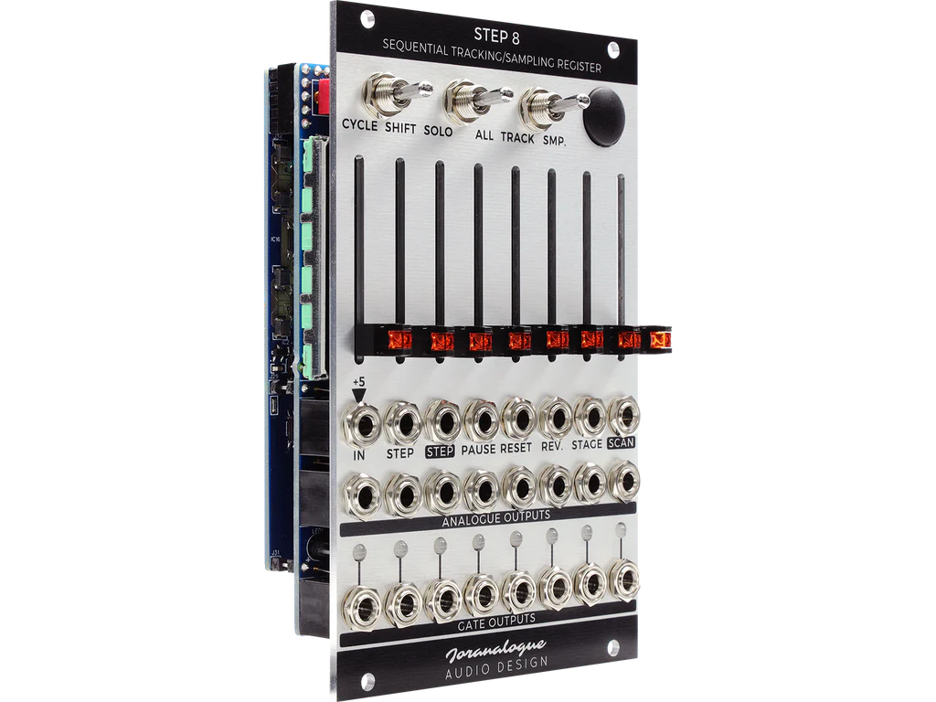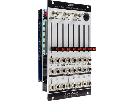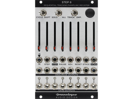 At its heart lies an analogue 1-to-8 signal switch feeding an octet of high-stability track/sample-and-hold stages. Each of these has its own analogue output with an attenuation slider, in addition to a gate output. LEDs visualise the status of each stage in real time. The switch can be controlled sequentially using the built-in 8-step counter, or addressed directly by an analogue control voltage (CV).