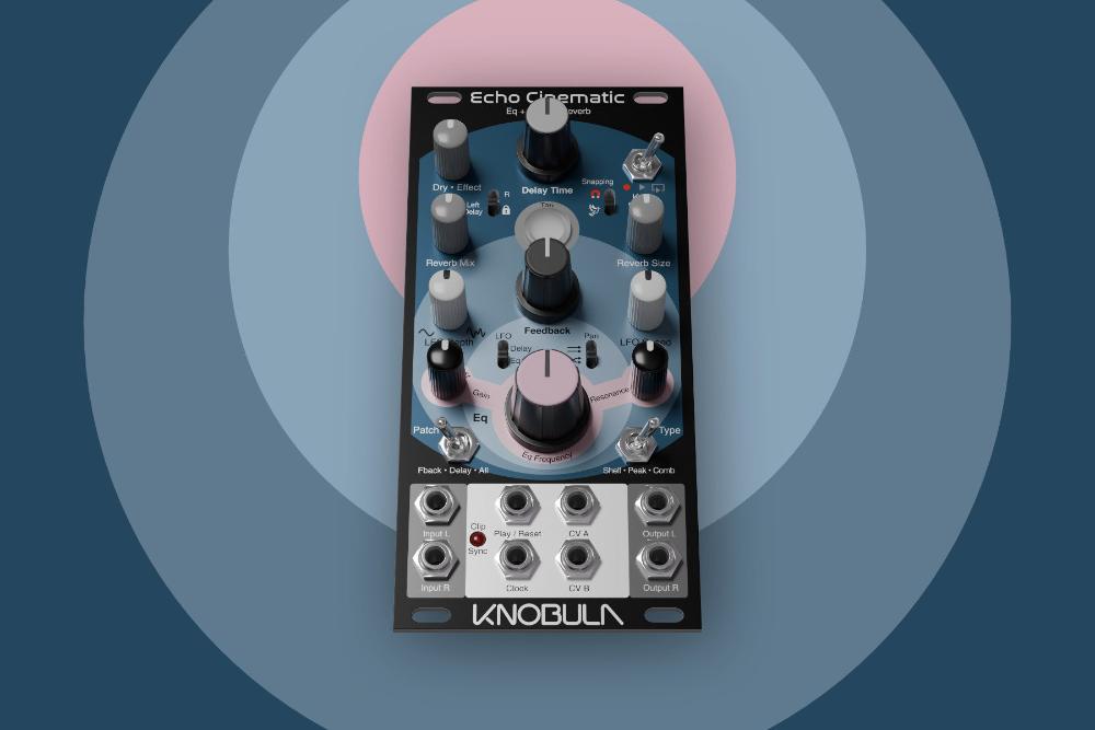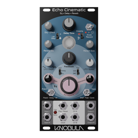 Echo Cinematic is a practical stereo effects device inspired by the dub music culture that emerged from Jamaica and landed in London during the early 1980s. Analog tape delays were routinely patched into the mixing desk through a channel strip, to be Eq'd and fed back to themselves via the FX send bus. The engineer could manipulate the Eq and FX send controls to create a constantly evolving rhythmic texture, a feedback loop teetering on the edge of self-oscillation. Echo Cinematic does away with the need for a sophisticated mixing desk and expands on this principle with a versatile resonant filter and five independent sources of automation built into the module; two LFOs for both Eq and delay modulation, a 30 second knob recorder capable of simultaneously controlling every knob on the front panel, and two external CV inputs, instantly assignable to any control as you insert a patch cable.