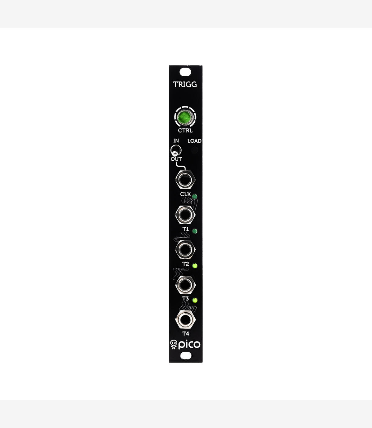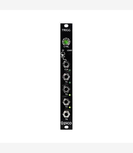 Erica Synths Pico Trigger module provides a master clock for the Pico System and it generates up to 16 step patterns of 4 triggers, simple clock divider patterns, and more advanced polyrhythmic patterns of different step length for triggering drums.