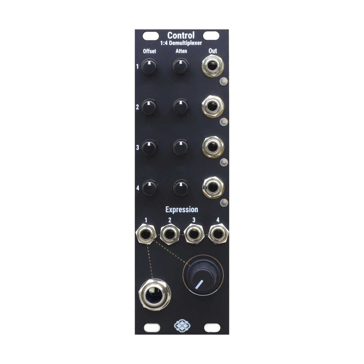 Control er en 8HP modul med fire kanaler for offset og attenuverter, utviklet for fleksibel CV-håndtering i Eurorack. Modulen kan brukes frittstående eller styres med et expression-pedal (0–8V), noe som åpner for fotstyrt performance.