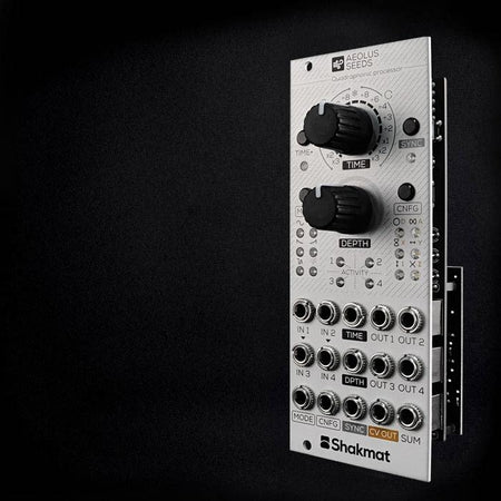 Aeolus Seeds manipulate the dynamics of a fully analog signal path through four VCAs driven by a handy multi channel modulation source.