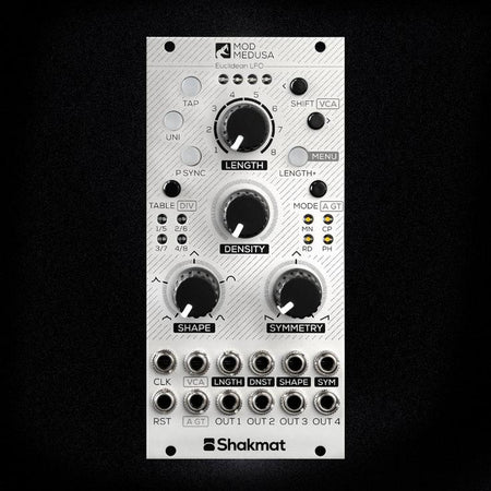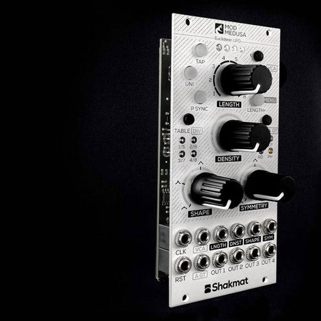 In a simplistic way, The Mod Medusa could be described as an Euclidean LFO: an “algorhythmic” modulation source which produces variable period LFO signals synced to rhythmic patterns. Those patterns are generated by algorithms such as the Euclidean one or different ones coming from the White and Knight's Gallop. The Mod Medusa has 4 outputs generating 4 correlated LFOs, which give different “polyrhythms” according to the chosen mode. Generated waveforms can easily be twisted using the symmetry and shape parameters which continuously morph the signal into different waveshapes. Many on-panel controls, assignable Gate and VCA Inputs turn the Mod Medusa into a strong performance tool. A very unique approach which leads to instantaneous and original results.